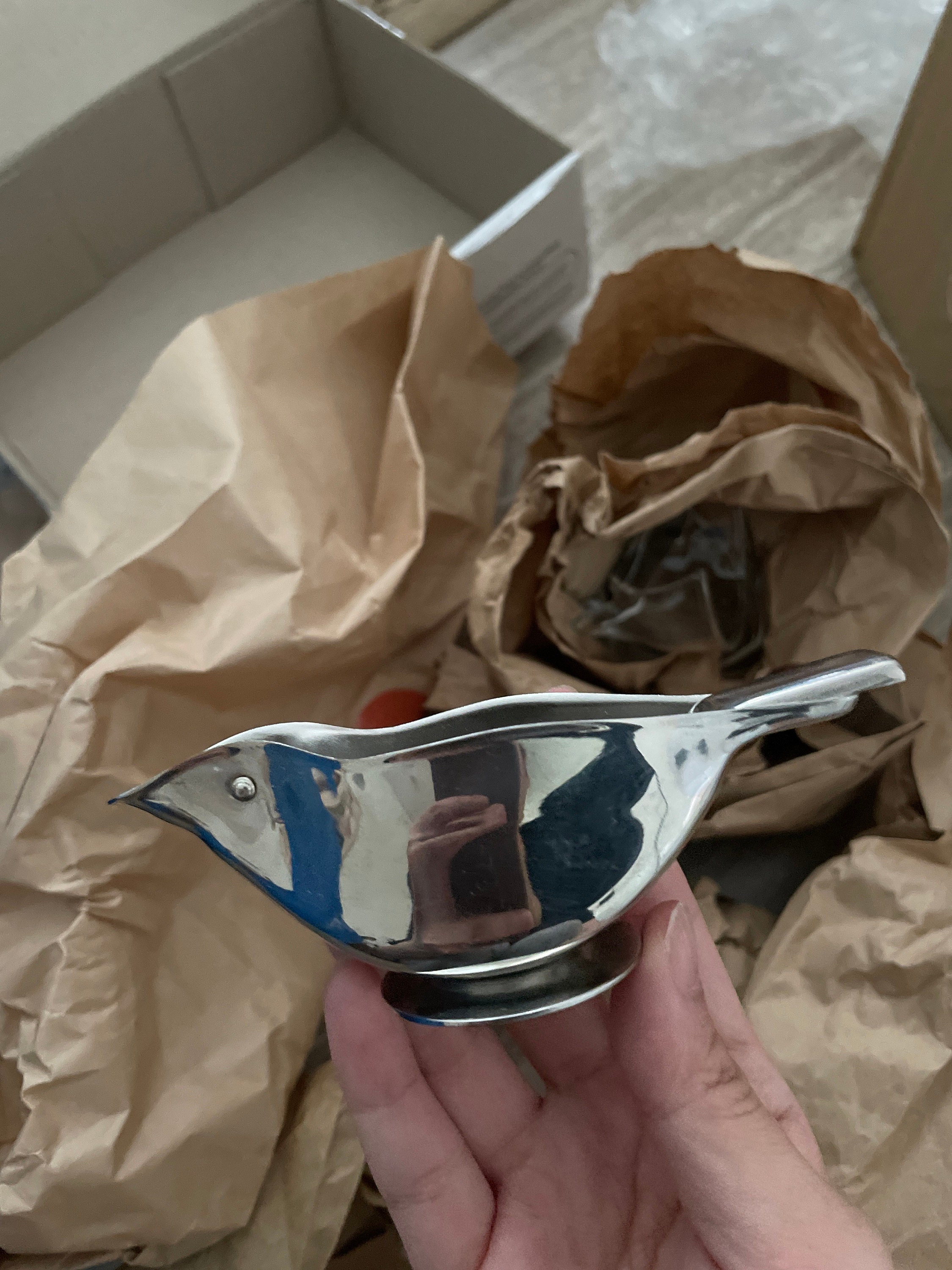 A delicate lemon wedge juicer in the form of a chirping bird.